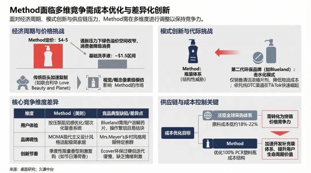 面对价格战和新模式的冲击,供应链成本控制成为Method生存的关键。依托庄臣的全球采购体系,其原料成本比独立品牌低约18%-22%。如何将这一成本优势转化为终端价格竞争力,同时加速开发补充装体系以锁定用户,将是Method未来需要解决的核心问题。