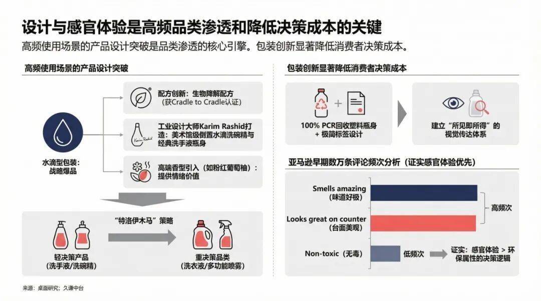 这种包装创新极大地降低了消费者的选择成本。在货架上,Method的产品靠外观就能脱颖而出。在亚马逊早期的数万条评论中,关于气味好闻、外观好看的反馈,其出现频率甚至超过了对无毒成分的关注。这证明,感官体验是促使消费者购买的首要因素。