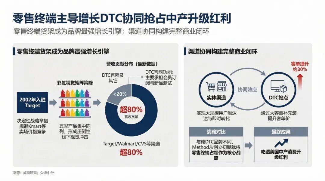 到2017年被庄臣公司收购时,Method与Ecover的合并年收入已达到约3亿美元。目前,Method的全球年零售额估计在5亿至7亿美元之间。值得注意的是,其超过80%的销售额来自实体零售渠道,而DTC官网的销售占比不到15%。