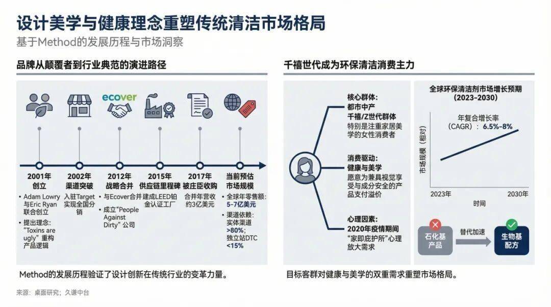 被庄臣收购,为Method带来了全球供应链的支持,但也引发了品牌调性可能被削弱的担忧。Method通过保持独立运营和延续Leaping Bunny无动物实验认证,稳住了核心用户。然而,真正的挑战来自市场本身。